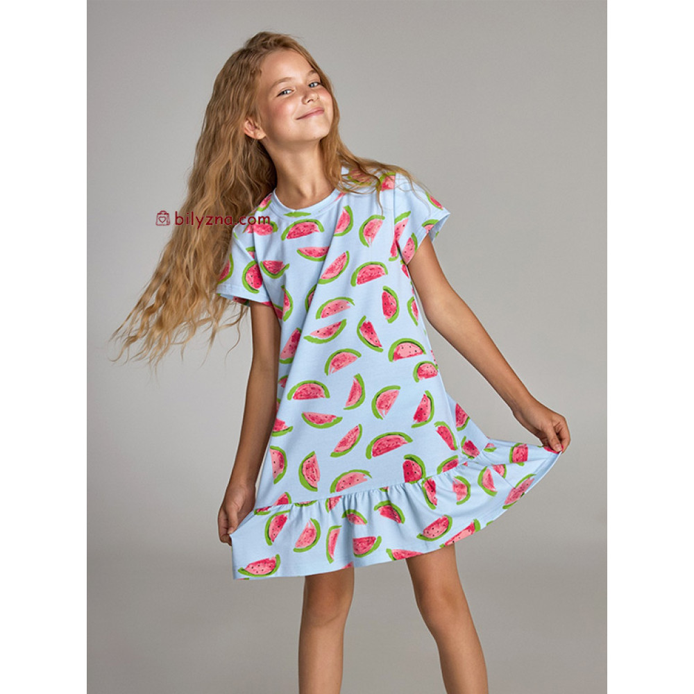 - Яскравий дизайн: оригінальний принт з кавунами на лазурному тлі перетворює звичайну сорочку на улюблену домашню сукню, яка підкреслює індивідуальність дитини.