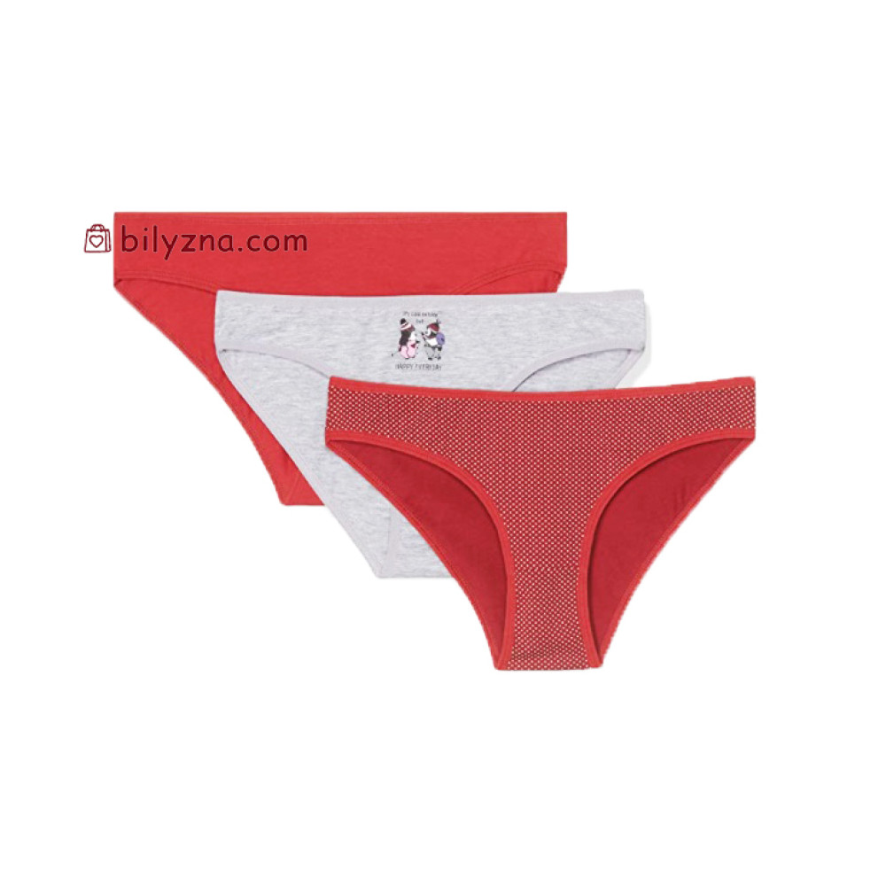 Запит «білизна з принтом» знаходить своє відображення у цьому наборі. Колекція включає глибокий червоний колір, елегантний сірий меланж та оригінальну модель у дрібний білий горошок на червоному фоні. Особливого шарму додає делікатний малюнок з пінгвінами на сірих трусиках, виконаний безпечними стійкими фарбами. Таке поєднання кольорів та принтів робить набір універсальним та водночас грайливим.